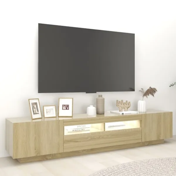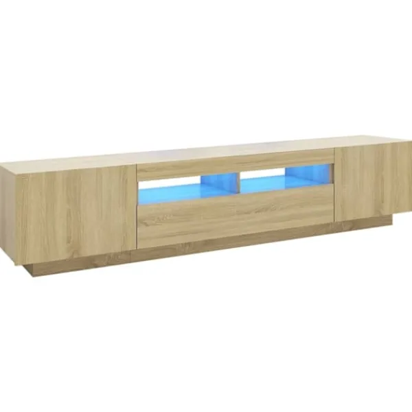 Tack vare sin trendiga och praktiska design blir denna TV-bänk med LED-belysning ett riktigt blickfång i ditt rum. Denna TV-bänk har en robust konstruktion som gör det mycket hållbart. Det finns gott om utrymme för att förvara din DVD-spelare, spelkonsol, strömenhet och mediebärare prydligt organiserade. Denna TV-bänk har RGB LED-lampor, med olika menyer för att ändra färg på lamporna och ställa in automatisk färgjustering. LED-lamporna understryker det moderna utseendet och bidrar till dess trendiga känsla. Dessutom är denna TV-enhet lätt att rengöra med en fuktig trasa. Obs: Denna tv-bänk består av 1 skåp med LED-lampor och 1 skåp som kan delas upp i 2 små skåp.Denna produkt har en USB-kontakt, men den certifierade 5V USB-strömkällan ingår inte.
