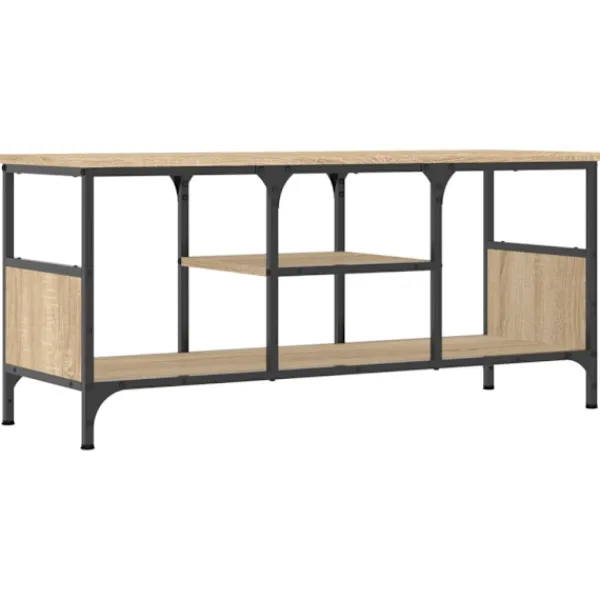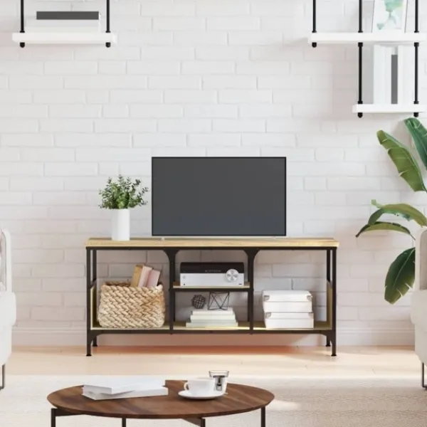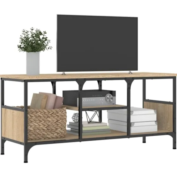 Denna tv-bänk i industriell stil blir ett praktiskt blickfång i inredningen. Robust material: Det konstruerade träet är av exceptionell kvalitet med slät yta och är också starkt, stabilt och fuktbeständigt. Tv-bänken är tillverkad av konstruerat trä och är lätt att rengöra med en fuktig trasa.Gott om förvaringsutrymme: Tv-bänken har hyllor för att hålla spelkonsoler och dvd-spelare inom räckhåll och prydligt organiserade.Stabil ovansida: Tv-möbelns ovansida är en bra plats att ställa saker som böcker och annan inredning.