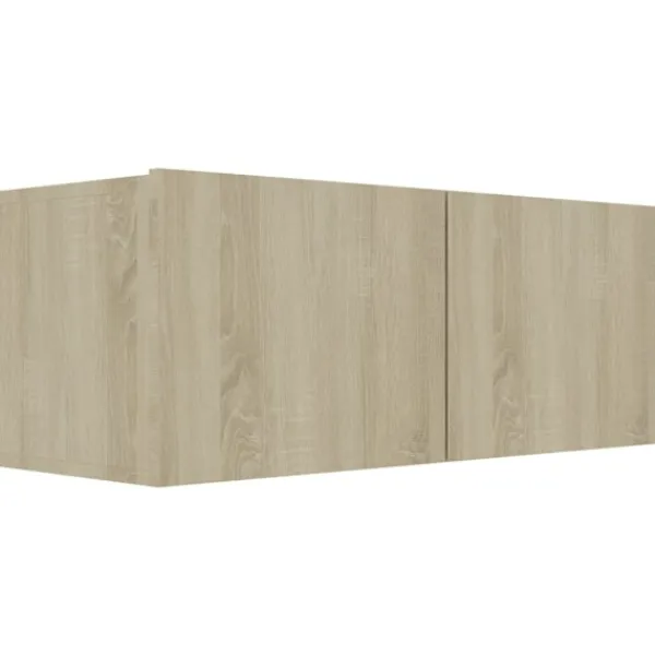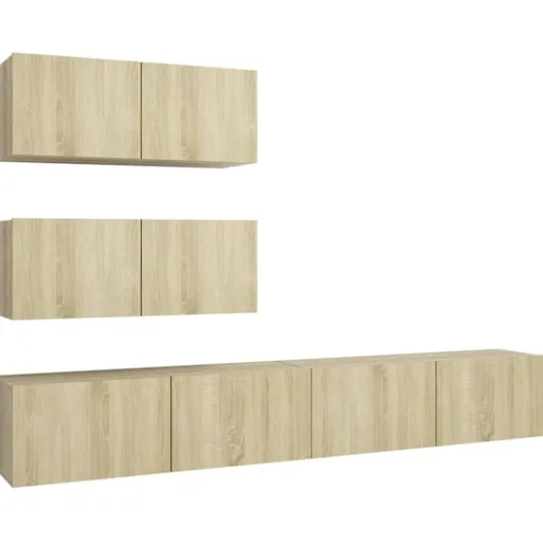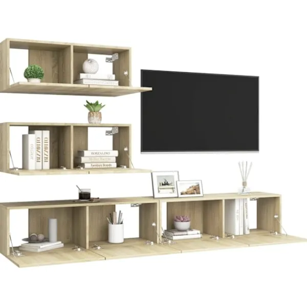 Denna uppsättning TV-skåp med modern design och stort förvaringsutrymme blir en mittpunkt i ditt vardagsrum. Tv-skåpen är tillverkade i konstruerat trä, vilket gör dem robusta och stabila. Skåpen fästs till väggen, vilket gör det till ett tidlöst tillskott till ditt hem. Setet har flera fack som gör det till en bra plats för att lagra alla dina tidningar, DVD-skivor eller andra föremål. Detta Hifi skåpset är lätt att rengöra med en fuktig trasa.