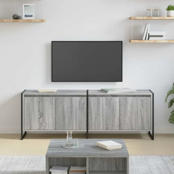 Denna tv-bänk utstrålar modern och industriell stil och passar in i vilket rum som helst. Med sin konstruktion i konstruerat trä och rektangulära design är den både snygg och funktionell, och ger bra med förvaring för olika mediekomponenter. Materialkombinationen ger både stil och hållbarhet, perfekt för den som vill ha en stilren men robust lösning.