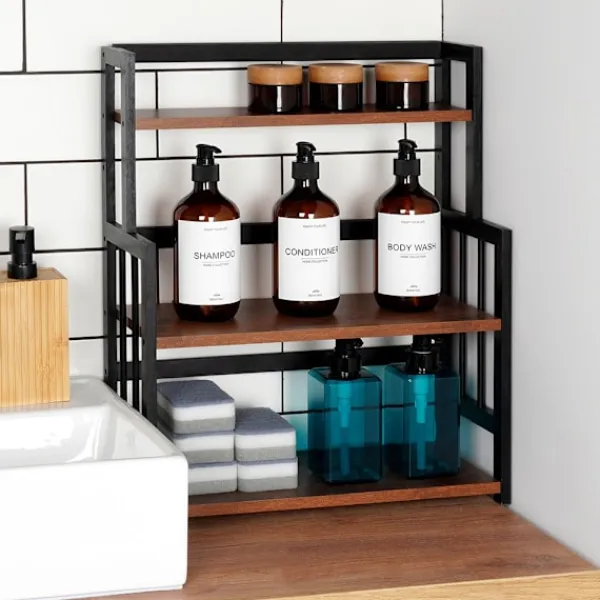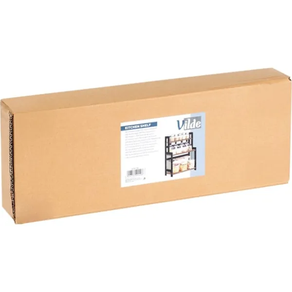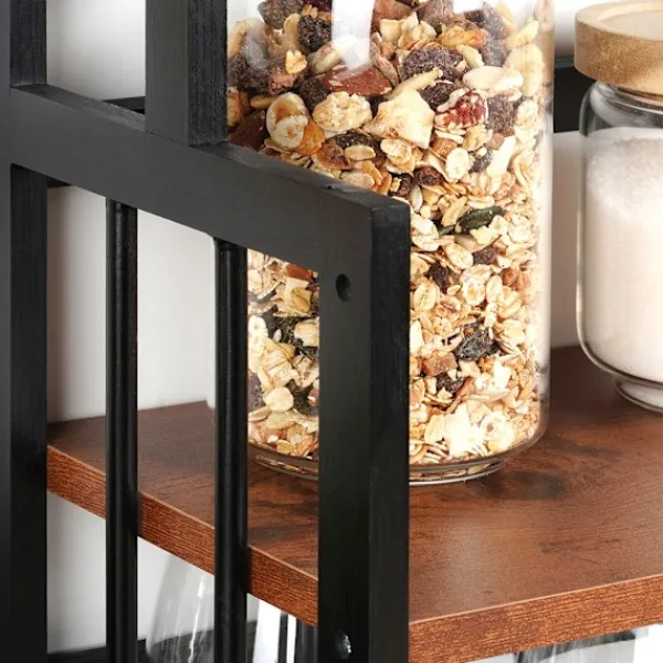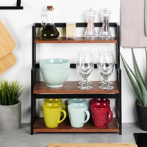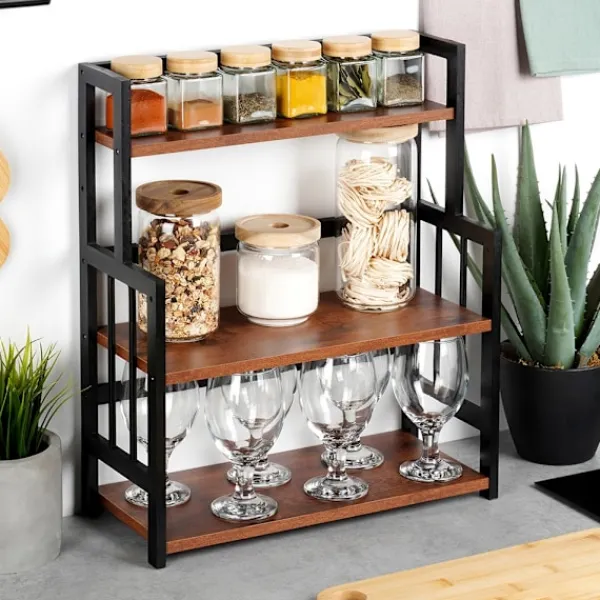 En kökshylla i tre nivåer förbättrar utrymmesorganisationen i köket, vilket gör den idealisk för förvaring av kryddor, koppar, behållare eller skålar.